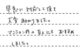 早急に対応して頂き、大変助かりました。マンション内の友人にもおすすめしました。