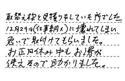 大変早くて助かりました。年末だったので、12/29心配しましたが、お正月に風呂に入れるので、うれしかったです。