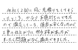 他社(2社)に同じ見積りをしてもらったところ、かなりお値打ちにできたので、満足している。値段が安くなったので、工事の仕上がりに、多少不安があったが、まったく問題がなく、満足できました。
