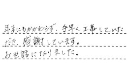 年内の取り替えはむずかしいと言われていたのを、年内に工事をしていただけて、大変ありがたく思っております。予定がいっぱいの中、時間を作って工事にあたっていただき、ありがとうございました。