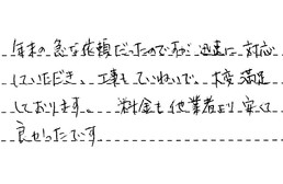 年末の急な依頼だったのですが、迅速に対応していただき、工事もていねいで、大変満足しております。料金も他業者より安くて良かったです。