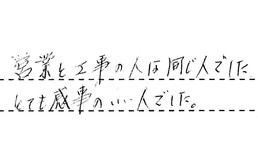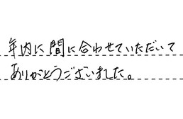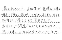 暮の忙しい中、吉田様が見積りに来て頂き、丁寧に説明して下さいました。そして年内に工事までして頂きました。本当に大問屋さんにしてよかったと思います。ありがとうございました。