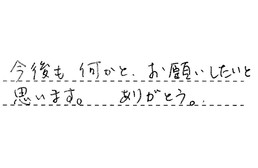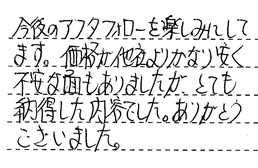 今後のアフターフォローを楽しみにしてます。価格が他社よりかなり安く、不安な面もありましたが、とても納得した内容でした。ありがとうございました。