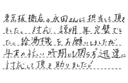 東京板橋店の永田さんに担当して頂きました。対応、説明等、完璧でした。給湯器をお願いしましたが、年末の忙しい時期にも関らず、迅速に対応して頂き、助かりました。
