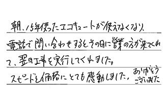 朝、15年使ったエコキュートが使えなくなり、電話で問い合わせすると、その日に営業の方が来てくれて、翌日工事を実行してくれました。スピードと価格にとても感動しました。ありがとうございました。