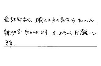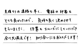 見積もりの連絡も早く、電話の印象もとても良かったので、気持ち良く決めさせてもらいました。作業もスムーズにしていただき、全て大満足です!知り合いにもおススメします!