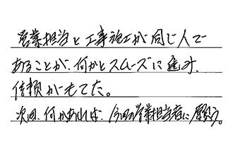 営業担当と工事施工が同じ人であることが、何かとスムーズに進み、信頼がもてた。次回、何かあれば、今回の営業担当者に願う。