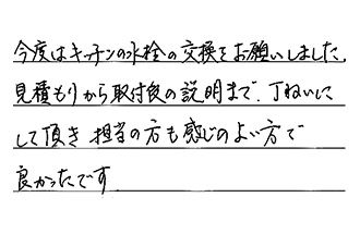 今度はキッチンの水栓の交換をお願いしました。見積もりから取付後の説明まで、丁ねいにして頂き、担当の方も感じのよい方で、良かったです。