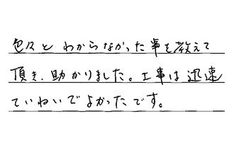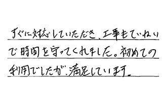 すぐに対応していただき、工事もていねいで、時間を守ってくれました。初めての利用でしたが、満足しています。