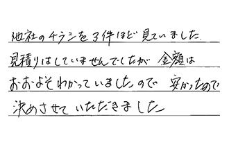 他社のチラシを3件ほど見ていました。見積りはしていませんでしたが、金額はおおよそわかっていましたので、安かったので、決めさせていただきました。