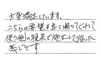 大変満足しています。こちらの要望も良く聞いてくれて、使う側の視点で施工して頂いた感じです。
