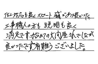 TEL対応も良く、スピード感があり良かった。工事職人の方も説明も良く満足です。初めての大問屋さんでしたが、良かったです。有難うございました。