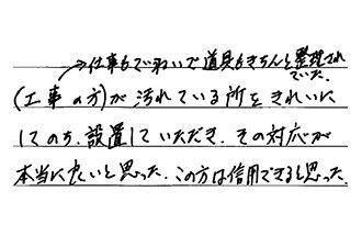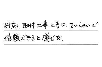 工事の方(仕事もていねいで、道具もきちんと整理されていた)が、汚れている所をきれいにしてのち、設置していただき、その対応が本当に良いと思った。この方は信用できると思った。