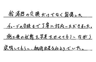 給湯器の交換だけでなく、裂傷したチューブの交換まで丁寧に対応いただきました。施工後の状態を、写真をみせてもらいながら説明してもらい、納得出来る仕上りでした。