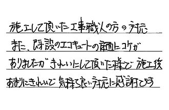 施工して頂いた工事職人の方の対応、また、既設のエコキュートの床面にコケがありましたが、きれいにして頂いた様で、施工後あまりにきれいで、気持ち良い対応に感謝です。