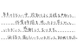 年末の忙しい中、段取りよく日程を取って、作業時間も思ったより早くやっていただいて、感謝しております。価格も割引いていただいて、助かりました。