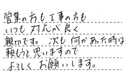 営業の方も工事の方も、いつも対応が良く親切です。次も何かあった時は、頼もうと思いますので、よろしくお願いします。