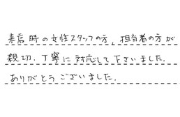 来店時の女性スタッフの方、担当者の方が、親切、丁寧に対応して下さいました。ありがとうございました。