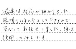 迅速な対応で助かりました。説明もハキハキとして下さるので、安心してお任せしました。後は使用してみてです。
