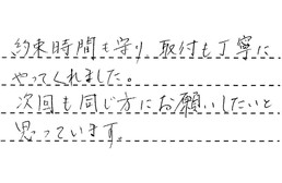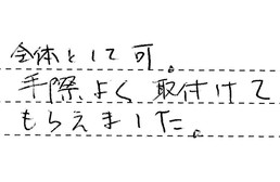 約束時間も守り、取付も丁寧にやってくれました。次回も同じ方にお願いしたいと思っています。