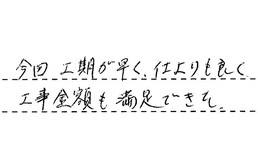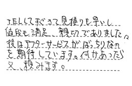 TELしてすぐきて見積りも早いし、値段も満足、親切でありました。後はアフターサービスがばっちりなのを期待しています。何かあったら、又、頼みます。