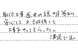 取付工事途中の説明等あり、安心して、又、納得して工事をやってもらった。満足です。