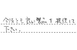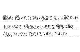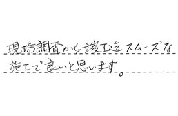 最初は、聞いたことのない名前で、すこし心配でした。友人の紹介で、お電話させていただき、営業ッ工事を含め、スムーズに施工していただきました。