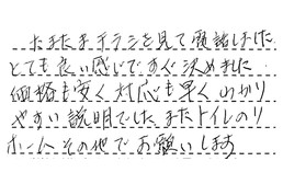 たまたまチラシを見て、電話しました。とても良い感じで、すぐ決めました。価格も安く、対応も早く、わかりやすい説明でした。またトイレのりホームその他でお願いします。