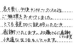 急を要し、午後4:00~7:30迄、ご無理をおかけしました。とても親切に説明いただき、感謝致します。加藤さんに感謝しています。快適な生活をしています。