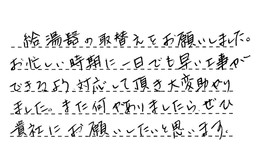 給湯器の取替えをお願いしました。お忙しい時期に、一日でも早い工事ができるよう、対応して頂き、大変助かりました。また何かありましたら、ぜひ貴社にお願いしたいと思います。
