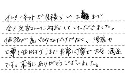 インターネットで見積り ~ 工事まで、全て光安さんに対応していただきました。価格が良心的なだけでなく、接客や工事(後片付け)まで非常に丁寧で、大変満足です。本当にありがとうございました。