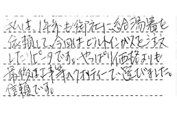 私は、1年前も御社に給湯器を依頼して、今回はビルトインガスを注文したリピータです。やっぱり価格よりも、最後は工事等のクオリティーで選びました。信頼です。