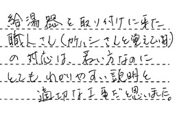 給湯器を取り付けに来た職人さん(カケハシさんと覚えています)の対応は、若い方なのに、とてもわかりやすい説明と、適切な工事だと思いました。