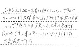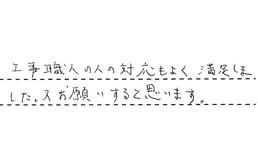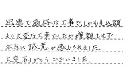 迅速で的確な工事で、しかも見積額より大変な工事でしたが、増額もせず、本当に誠意が感じられました。大変ありがとうございました。