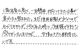 満足度は高く、一生懸命対応して下さった事が、良かったと思えました。まだ使用回数が少ないのでわかりませんが、何かあった時にご相談できそうな感じがいたしましたので、今後のケアに期待したいです。