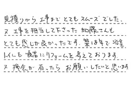 見積りから工事まで、とてもスムーズでした。又、工事を担当して下さった加藤さんも、とても感じが良かったです。築18年で、浴室・トイレも順番にリフォームを考えております。又、機会が有ったら、お願いしたいと思います。