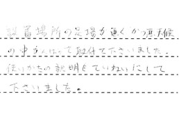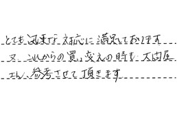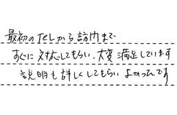 最初のTELから訪問まで、すぐに対応してもらい、大変満足しています。説明も詳しくしてもらい、よかったです。
