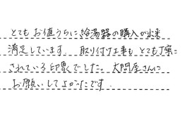 とてもお値うちに給湯器の購入が出来、満足しています。取り付け工事も、とても丁寧にされている印象でした。大問屋さんにお願いしてよかったです。