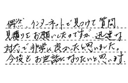 偶然、インターネットで見つけて、質問・見積りをお願いしたのですが、迅速な対応で、非常に良かったと思いました。今後もお世話になりたいと思います。