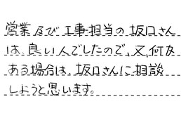 営業及び工事担当の坂口さんは、良い人でしたので、又、何かある場合は、坂口さんに相談しようと思います。