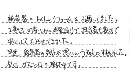 給湯器とトイレのリフォームをお願いしました。工事日、内容ともに、希望通りで、担当者も親切で、安心してお任せできました。早速、給湯器の調子が悪いという知人にすすめました。次はガスコンロを検討中です。