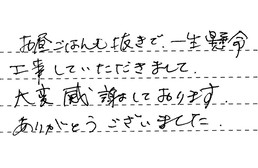 お昼ごはんも抜きで、一生懸命工事していただきまして、大変感謝しております。ありがとうございました。