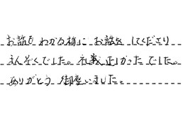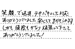 笑顔で迅速、テキパキとした対応、ありがとうございました。安心してまかせられます。しかも、値段もかなり頑張って下さって、ありがとうございました。