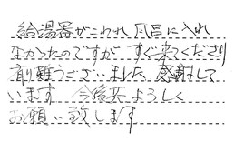 給湯器がこわれ、風呂に入れなかったのですが、すぐ来てくださり、有り難うございました。感謝しています。今後共よろしくお願い致します。