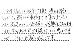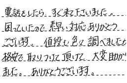 今回、隣人に紹介して頂き、工事をお願いしました。最初から最後まで、丁寧な対応と、とても満足のいく価格に感謝しております。また何かあれば、相談したいと思いますので、よろしくお願い致します。