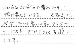 いい商品が安価で購入でき、非常に喜んでいます。又知人にも紹介したいと思います。アフターサービスも、ぜひよろしくお願いします。