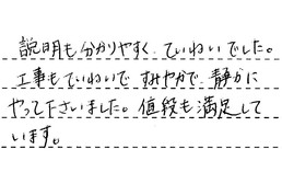 説明もわかりやすく、ていねいでした。工事もていねいで、すみやかで、静かにやって下さいました。値段も満足しています。