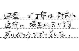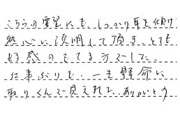 こちらの要望にもしっかり耳を傾け、熱心に説明して頂き、とても好感のもてる方でした。仕事ぶりも一生懸命に取りくんで見えました。ありがとう。