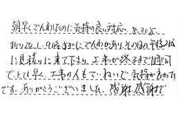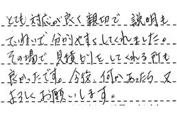 とても対応が良く、親切で、説明もていねいで、分かりやすくしてくれました。その場で見積もりをしてくれる所も良かったです。今後、何かあったら、又よろしくお願いします。
