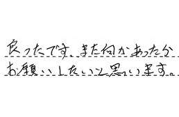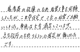 住宅のガス給湯器が壊れ、困って相談した所、スケジュール外の夕方遅く、当日取付け交換をして下さいました。岡田さん、ありがとうございました。